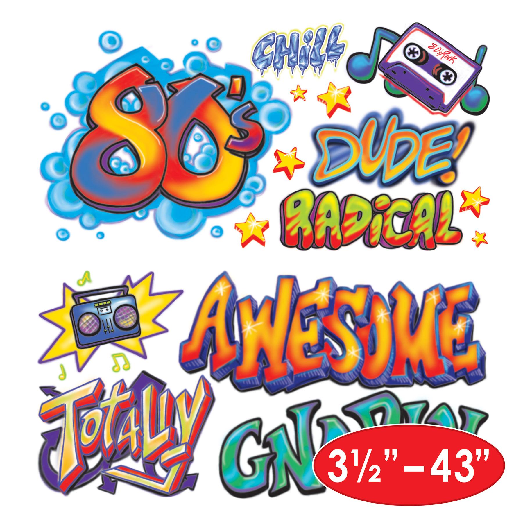 Product Description: Make your 80's themed party come to life with Our 80's Graffiti Props! These props come in a 15/pkg, with sizes ranging from 3"-3' 7". They are perfect for an insta-theme and feature bright, colorful designs that will make your party stand out. Easily attach these props to your backdrop or wall using your own adhesive or pins; scissors are required to cut pieces from the sheets. Plus, this item ships from our Pennsylvania warehouse within one business day! Make sure to add these props to your theme for an unforgettable 80's party.