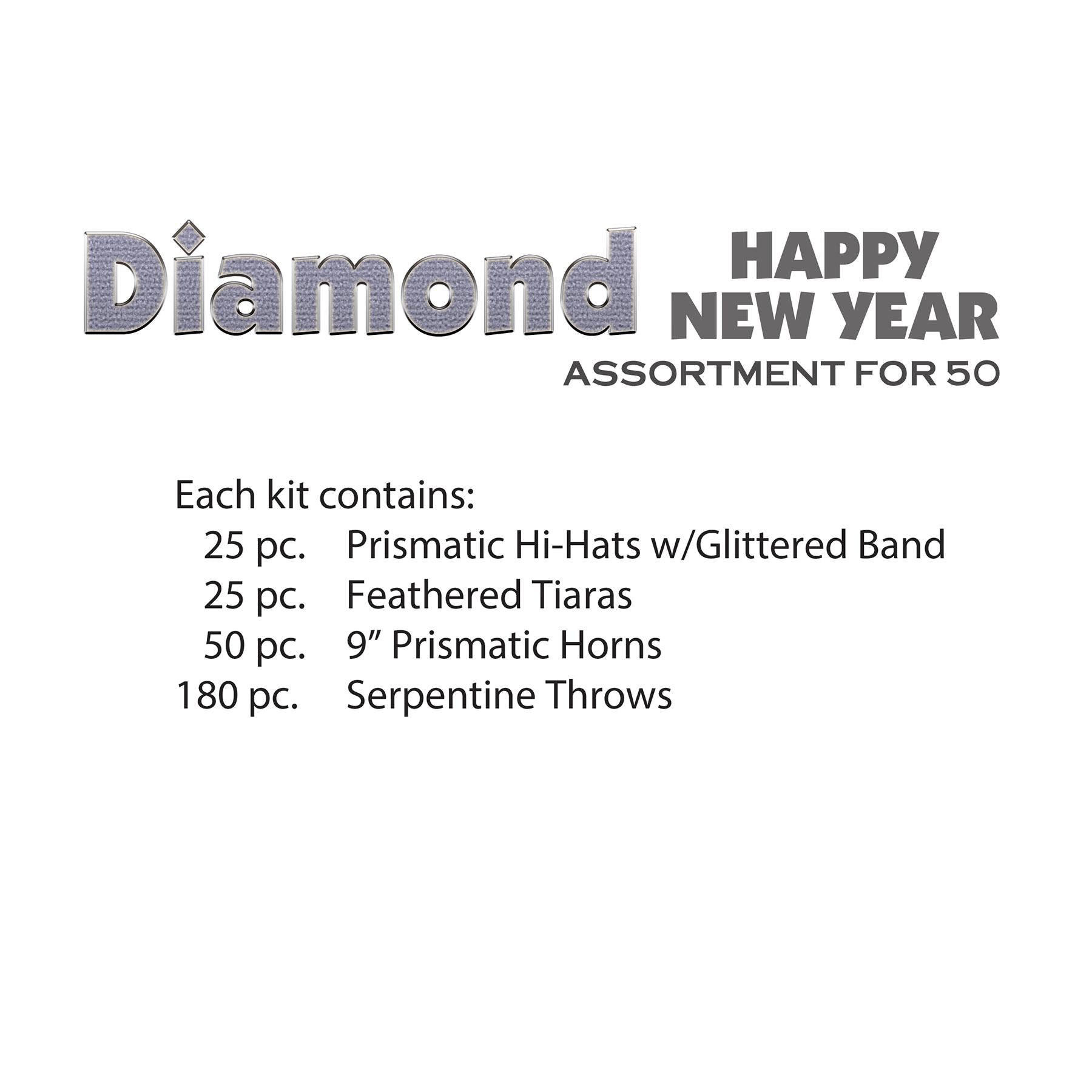 Welcome in the New Year in style with our Topaz Happy New Year New Year's Eve Party Kit for 50 People from BulkPartySupplies.com! This kit is perfect for any New Year's Eve theme party, and contains everything you need to make your celebration a success. The kit includes 25 Prismatic Hi-Hats with a glittered band, 25 Glittered Prismatic Feathered Tiaras, 50 9-inch Prismatic Horns, 80 FR Serpentine Throws, and 1 14-inch Foil Starburst. With this kit, you can easily create an unforgettable and festive New Year's Eve atmosphere. The kit ships from our Pennsylvania warehouse within one business day and is sure to make your New Year's Eve party a hit!