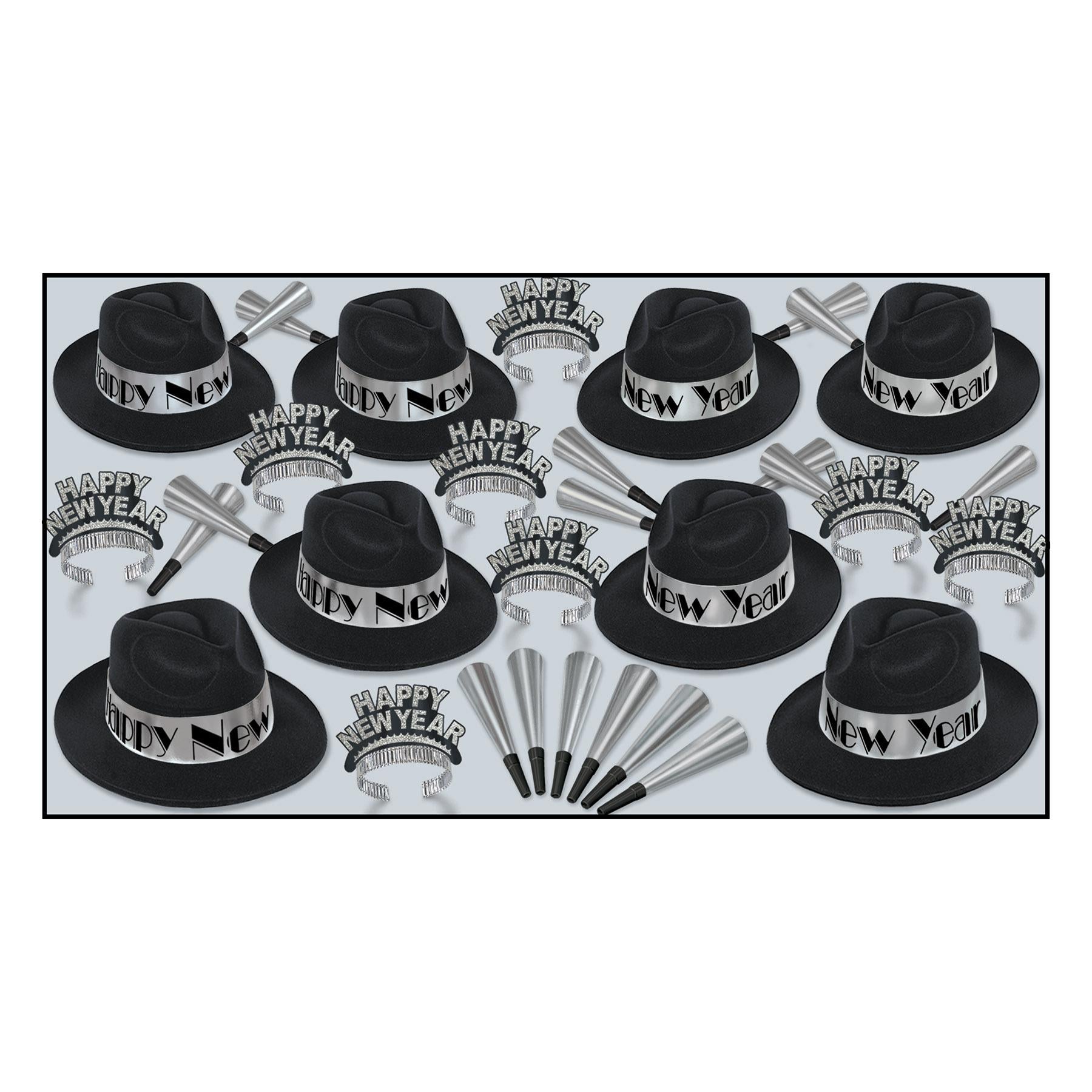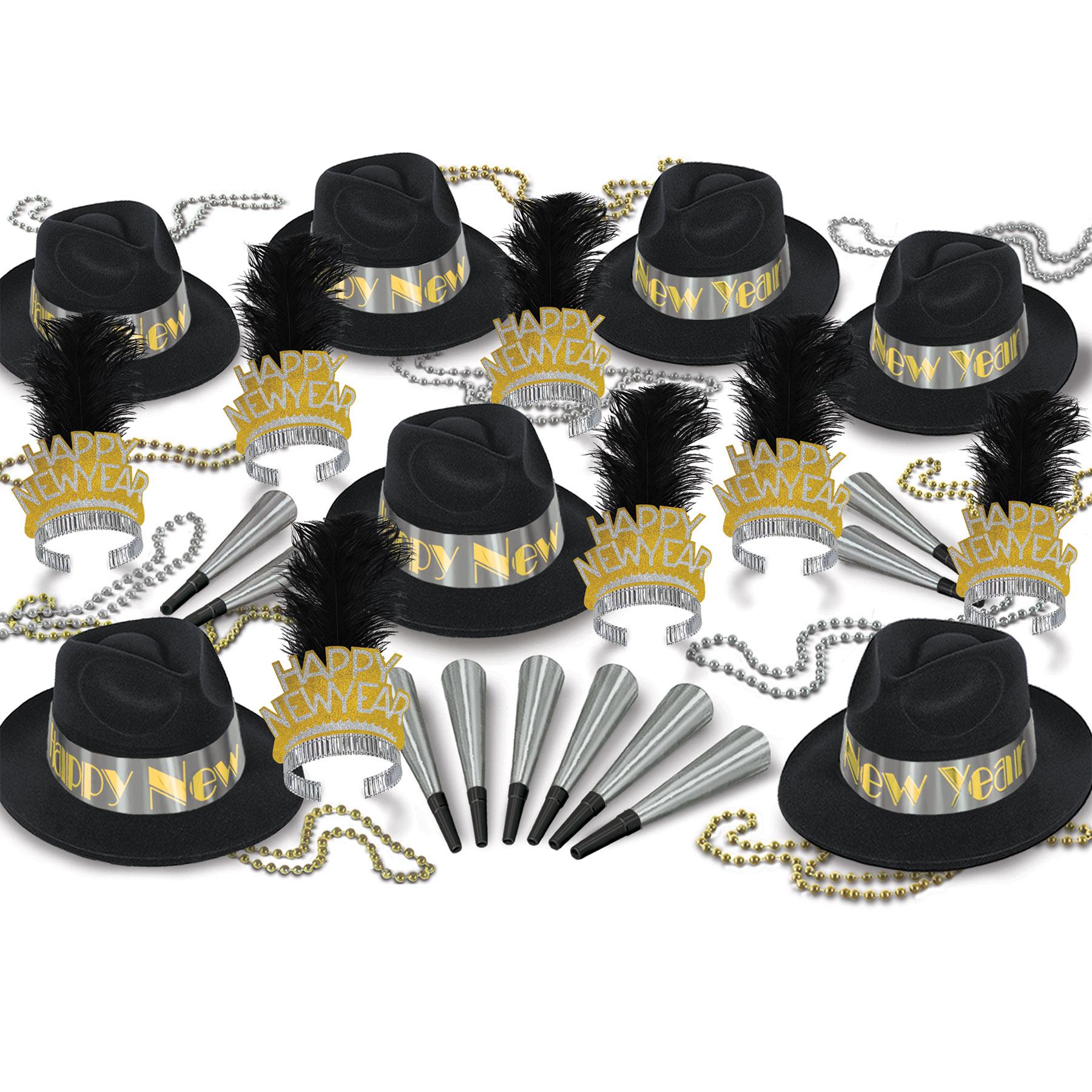 Product Description:Ring in the New Year with the Chicago Swing New Year's Eve Party Kit for 50 People from BulkPartySupplies.com! This kit has everything you need to host a memorable celebration, including velour fedoras, glittered plumed tiaras, foil horns, and party bead necklaces. With fast shipping from our Pennsylvania warehouse, your party supplies will arrive in time for the festivities. Whether you're planning a small or large gathering, this kit ensures your New Year's Eve party starts off right!