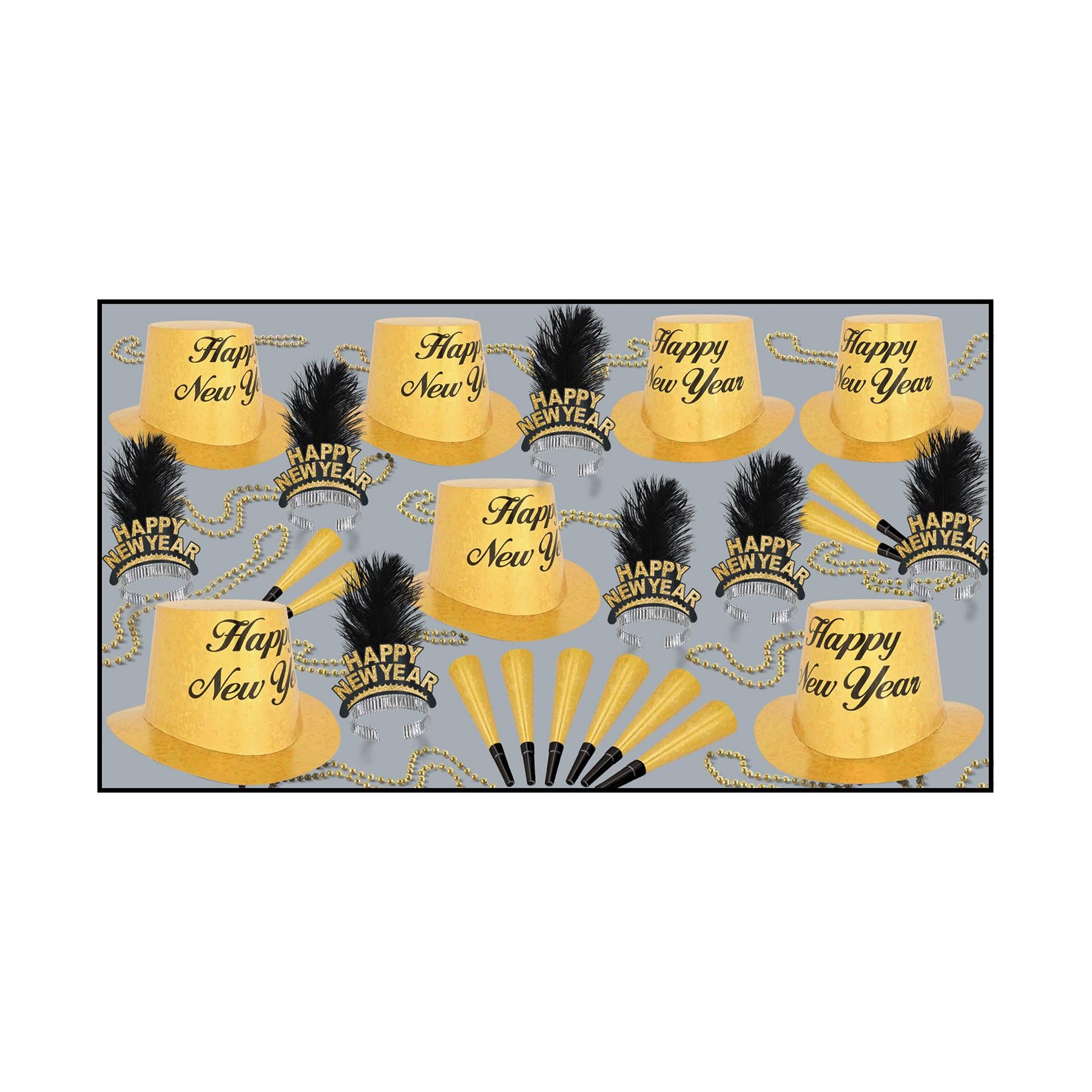 Celebrate New Year’s Eve in style with the Gold Entertainer New Year's Eve Party Kit for 50 People from BulkPartySupplies.com! This kit includes everything you need for a lively and memorable celebration. With printed foil hi-hats, glittered plumed tiaras, foil horns, metallic noisemakers, and party bead necklaces, you’ll have all the essentials to entertain your guests. With fast shipping from our Pennsylvania warehouse, your New Year’s Eve party will be ready to go in no time. Make your celebration unforgettable with the Gold Entertainer Party Kit!