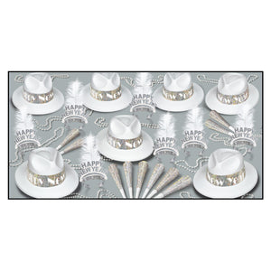 Celebrate in style with the LA Swing Silver New Year's Eve Party Kit for 50 People from BulkPartySupplies.com! This kit provides everything you need to throw an unforgettable New Year's Eve party, featuring velour fedoras, glittered plumed tiaras, prismatic horns, and party bead necklaces. With fast shipping from our Pennsylvania warehouse, your supplies will arrive in time for the festivities. Make your New Year’s Eve celebration truly memorable with the LA Swing Silver Party Kit!