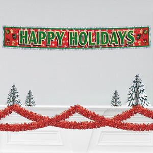 Product Description: Make your Winter/Christmas party extra special with the Metallic Happy Holidays Fringe Banner from BulkPartySupplies.com. This 7.5" x 5' banner is made of 1-ply PVC fringe and features a beautiful metallic finish. Perfect for any Winter/Christmas party, this banner is sure to make your guests feel festive and special. The package comes with one banner and ships from Pennsylvania warehouse within one business day. This banner is the perfect addition to any Winter/Christmas themed party and will be sure to bring a touch of holiday cheer to your guests. Make your Winter/Christmas party one to remember with the Metallic Happy Holidays Fringe Banner from BulkPartySupplies.com.