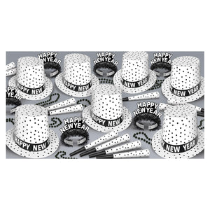 Celebrate in style with the New Year Tux Party Kit for 50 People from BulkPartySupplies.com! This elegant kit includes all the essentials for a memorable New Year's Eve, featuring printed hi-hats, fringed tiaras, foil horns, and party beads, all in a classy tuxedo theme. With fast shipping from our Pennsylvania warehouse, your party supplies will arrive just in time to make your event unforgettable. Get ready to ring in the New Year with the New Year Tux Party Kit!