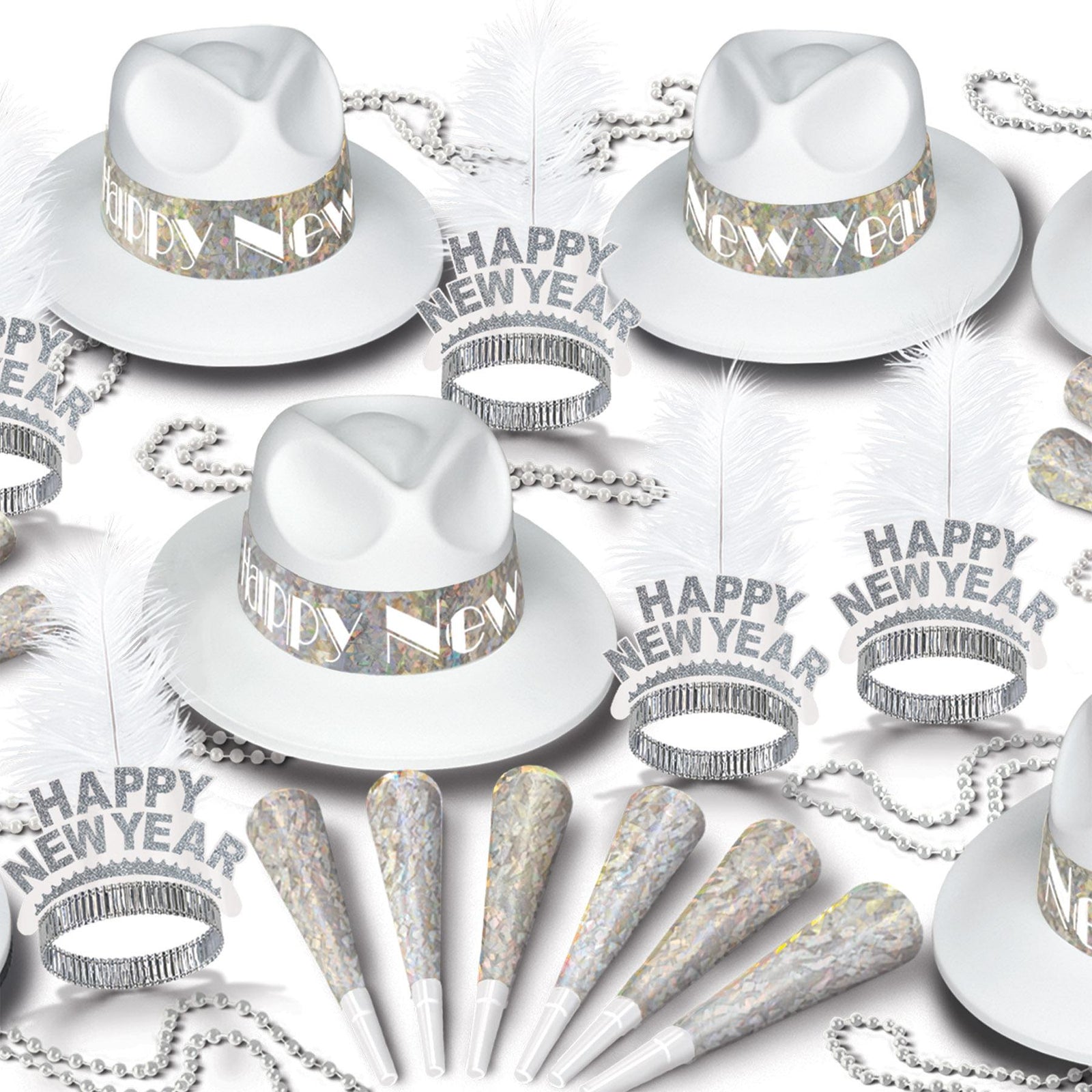 Celebrate in style with the 42nd Street New Year's Eve Party Kit for 50 People from BulkPartySupplies.com! This complete party kit is designed to ensure everyone has a great time, featuring glittered foil hi-hats, fringed tiaras, and foil horns. Made from high-quality materials, the kit guarantees a memorable New Year's Eve experience for your guests. With fast shipping from our Pennsylvania warehouse, you can be sure your party supplies will arrive in time. Make your celebration unforgettable with the 42nd Street New Year's Eve Party Kit!
