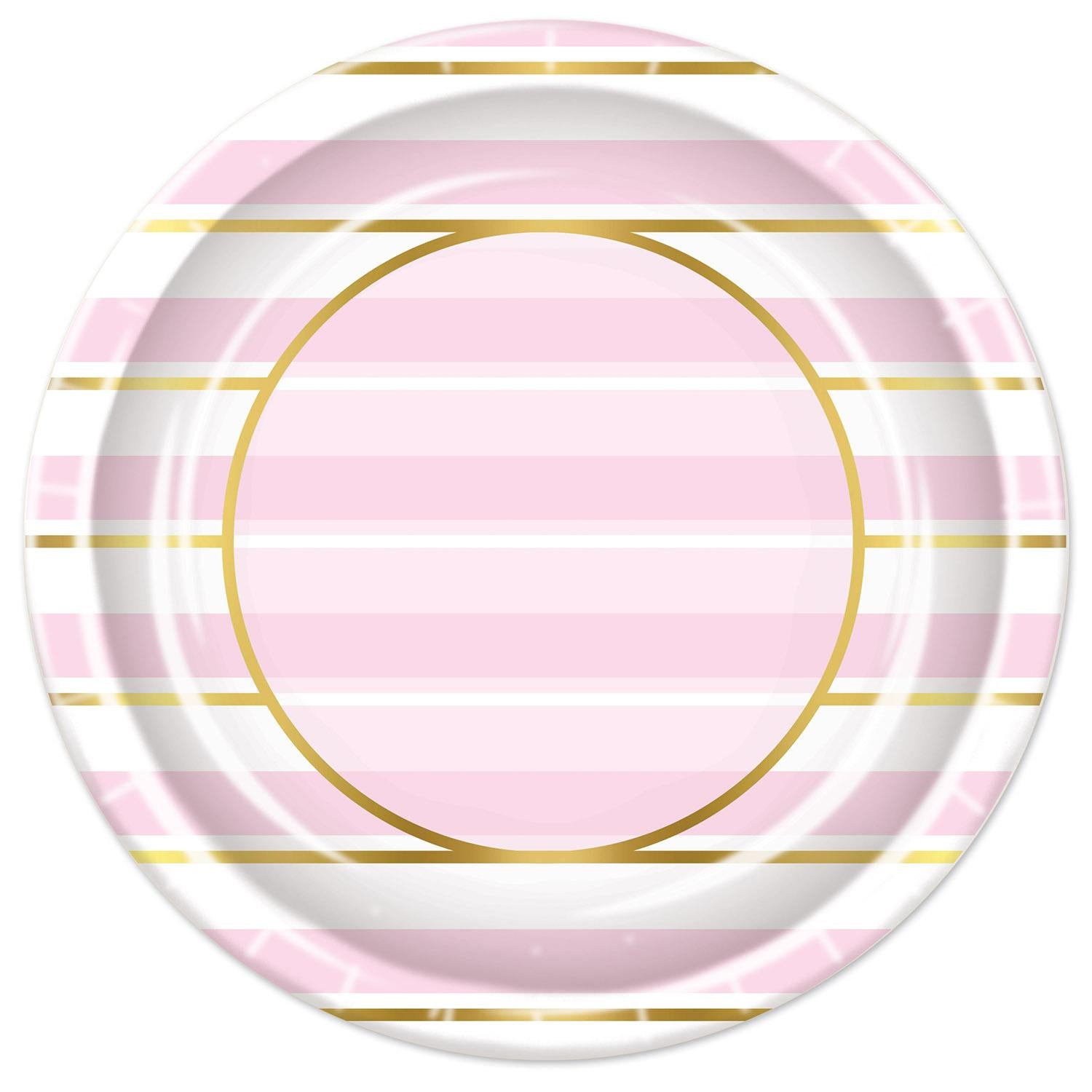Product Description: Our Striped Plates - Girl (8/Pkg) is the perfect way to add a touch of class to any baby shower. These plates come in a beautiful combination of pink, white, and gold and feature a classic striped design. Each plate is 9 inches in size and is sure to make a statement at any gathering. The plates are not microwave safe, but they still add a touch of elegance to any event. With 8 plates in each package, you can easily provide your guests with a unique and stylish dining experience. These plates are part of the Baby Shower Theme Party Supplies line from BulkPartySupplies.com, and you can trust that they will provide a quality and memorable experience. Ships from Pennsylvania warehouse within one business day!