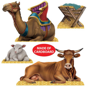 Our Nativity Scene Stand-Ups are the perfect addition to your Christmas/winter events. These novelty items are ideal for creating a festive atmosphere. With dimensions of Assorted and packaging of 4/Package, each case includes 4 packages, making it easy to cater to gatherings of any size. These versatile items enhance the ambiance of any celebration. Easel attached; assembly required; sheep–19 inch x 30.75 inch; manger–24.5 inch x 28.25 inch ; cow–34.25 inch x 5ft 2.75 inch ; camel–3ft 4 inch x 4ft 5.75 inch.
