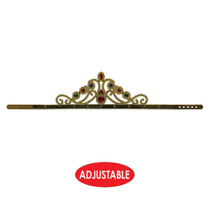 Details: Take your guests back to a time of chivalry and knights with this Plastic Jeweled Queen's Tiara! Adjustable - (1/package). 12 per case. Tiara adjusts from 19 to 22.5 inches circumference.