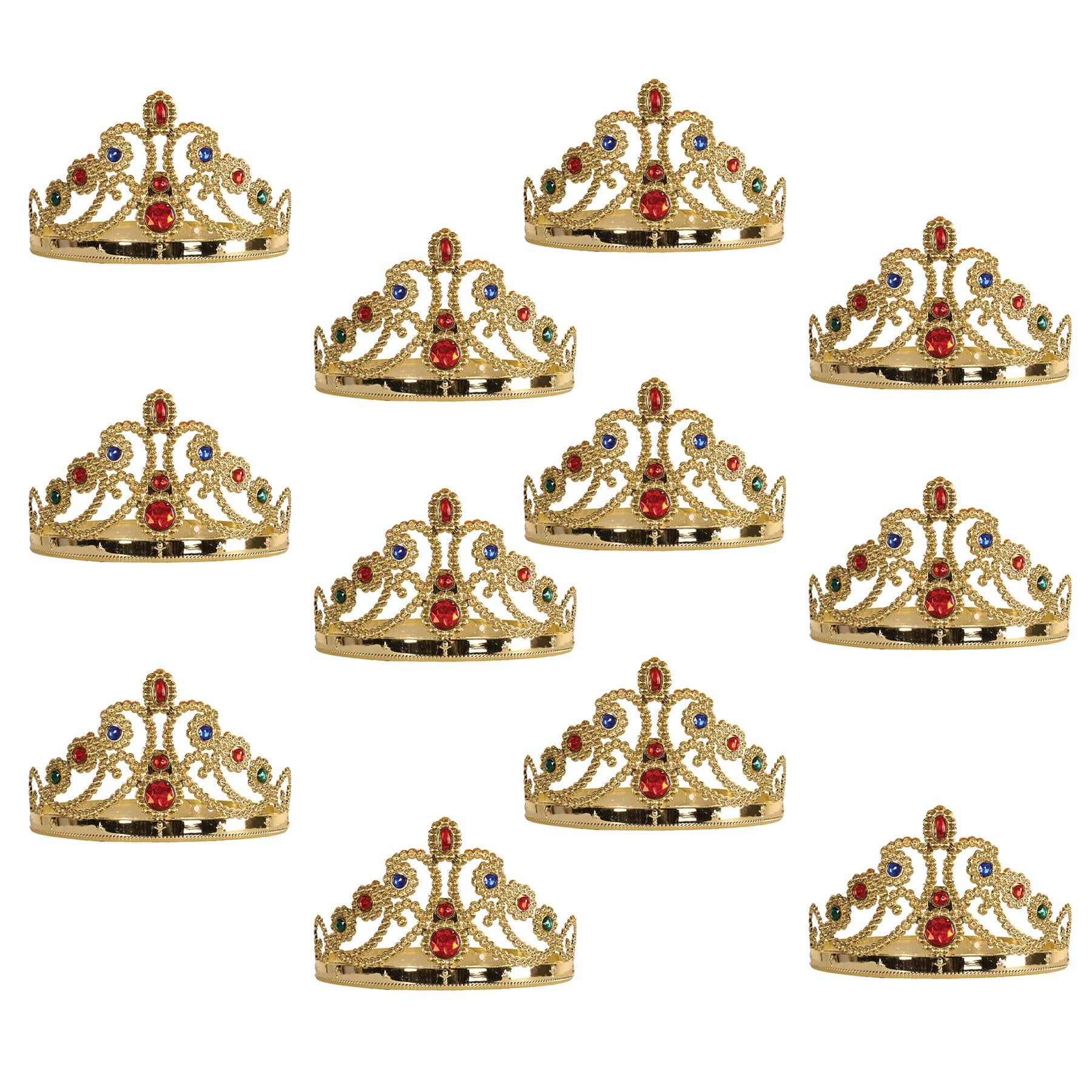 The Plastic Jeweled Queen's Tiara is perfect for Night to Shine, Mardi Gras celebrations or any other special occasion. It is made of molded plastic and features a beautiful gold finish. The tiara is adjustable and can easily fit most heads. The plastic jewels are securely embedded and won't come off easily. It makes a great accessory for any Mardi Gras costume or as part of a themed party. With its dazzling look, the Plastic Jeweled Queen's Tiara is sure to add some sparkle and bling to your special event. UPC: 034689602514, Package Count: (1/Package), Packages per Case: 12.