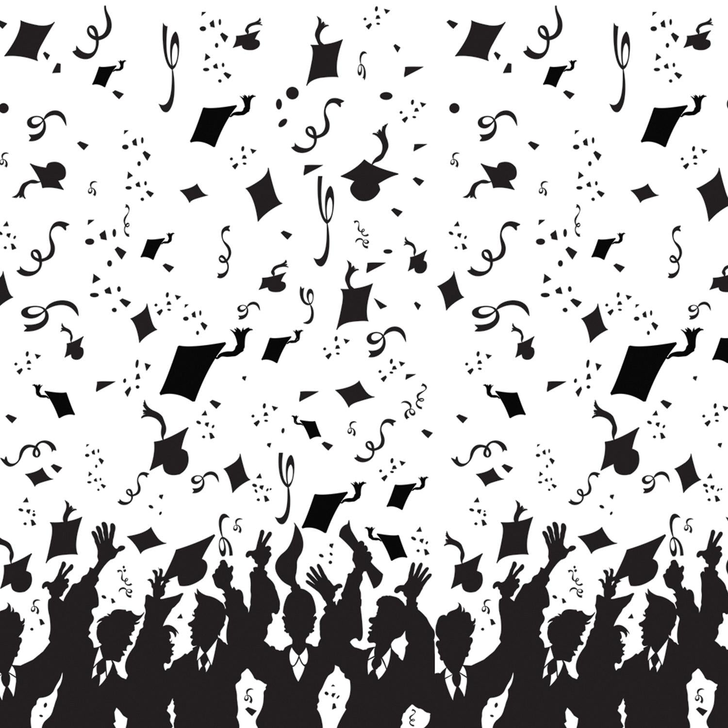 Features a white design with black graduates throwing caps border print.