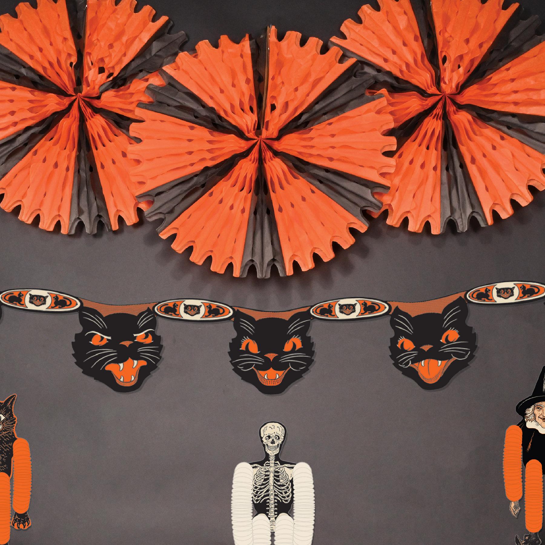 Details: Package Count: (3/Pkg) Size: 14" This item is a great selection for Halloween-Vintage, Hanging Decorations, Mostly Tissue Ships from Pennsylvania warehouse within one business day! Info: The Vintage Halloween Tissue Dancers is party of our Halloween-Vintage line of party decorations and party supplies. These Halloween Tissue Dancers have been hanging around homes since they were first introduced many decades ago, back in 1929. Now, after having been authentically reproduced by our Company, they can be enjoyed by current generations. The vintage artwork of these whimsical honeycomb tissue characters feature detailed graphics in an orange, black, and ivory color scheme. Printed on the front side, each cardstock character unfurls to approximately 14 inches in height and 6 inches in width. Each package includes three iconic characters: witch, skeleton, and black cat.