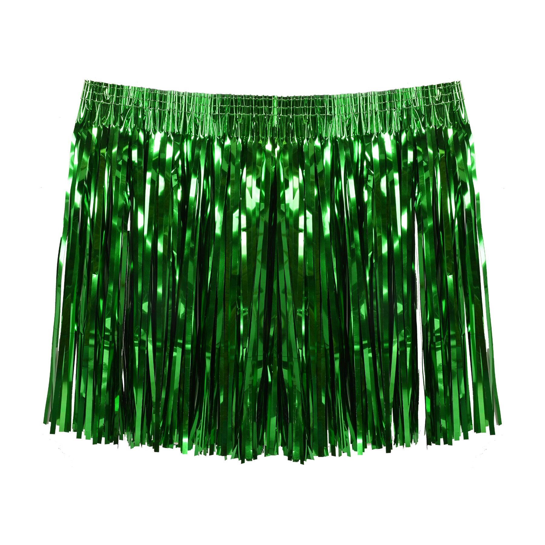 "This Tinsel Hula Skirt is perfect for your next luau! It's a bright green costume accessory that measures 33"W x 16"L. Package includes 1 skirt. 12 packages per case."