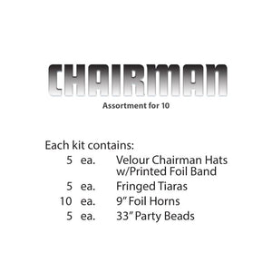 Welcome the New Year in style with the Chairman Party Kit for 10 People from BulkPartySupplies.com! This all-in-one kit provides everything you need to throw a fun and festive New Year’s Eve party, featuring velour hats, glittered tiaras, foil horns, and party bead necklaces. With fast shipping from our Pennsylvania warehouse, your supplies will arrive in plenty of time for the big night. Celebrate in style with the Chairman Party Kit!
