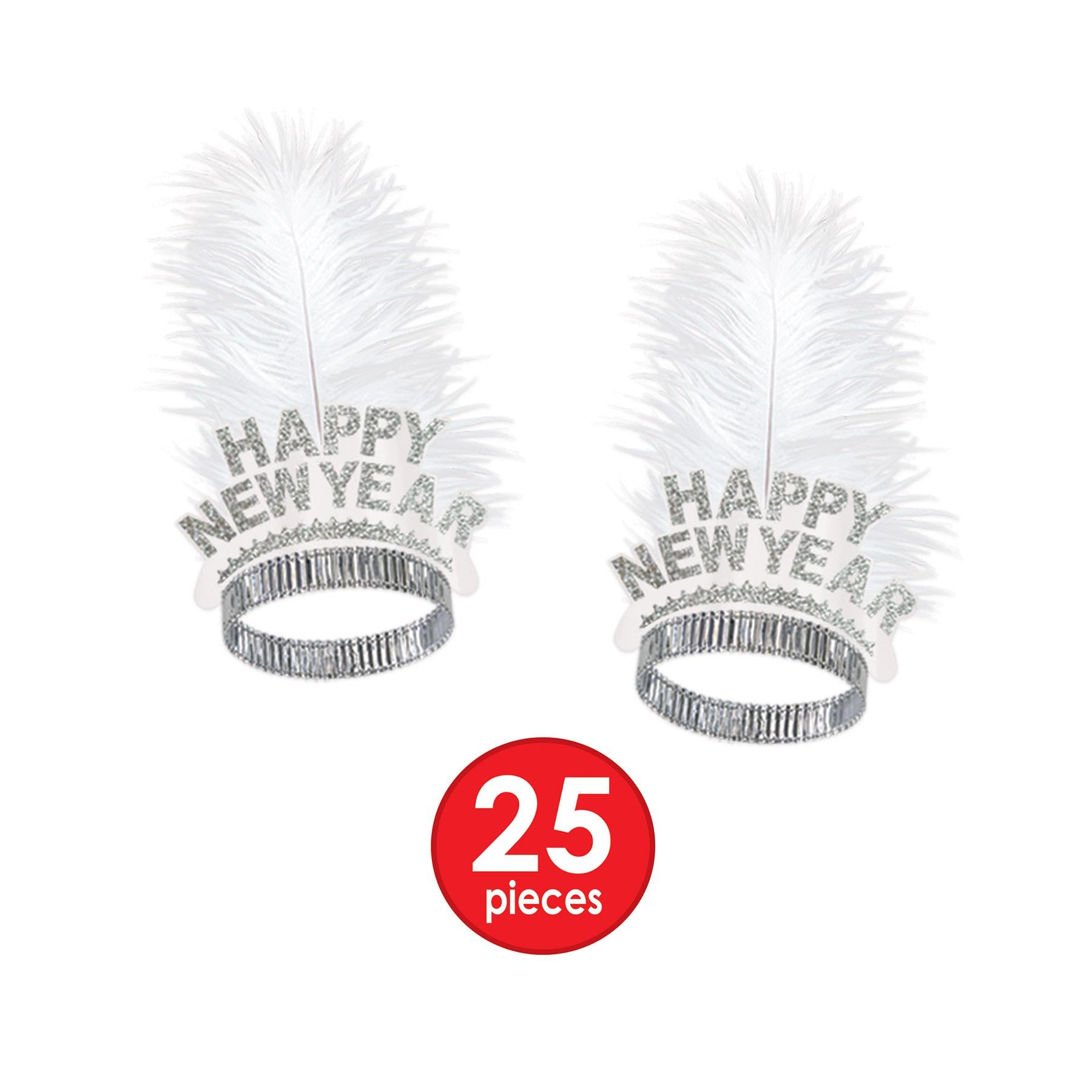 Our White Ice New Year's Eve Party Kit for 50 People is the perfect way to celebrate the new year in style. This party kit contains everything you need to ensure your party is a hit. With 25 velour toppers with printed foil bands, 25 glittered plumed tiaras, 50 9 inch foil horns, and 25 33 inch party beads, your guests will be sure to have a great time. With this kit, you can easily turn any ordinary room into a festive New Year's Eve party space. Get ready to celebrate the start of a new year with this White Ice New Year's Eve Party Kit from BulkPartySupplies.com.