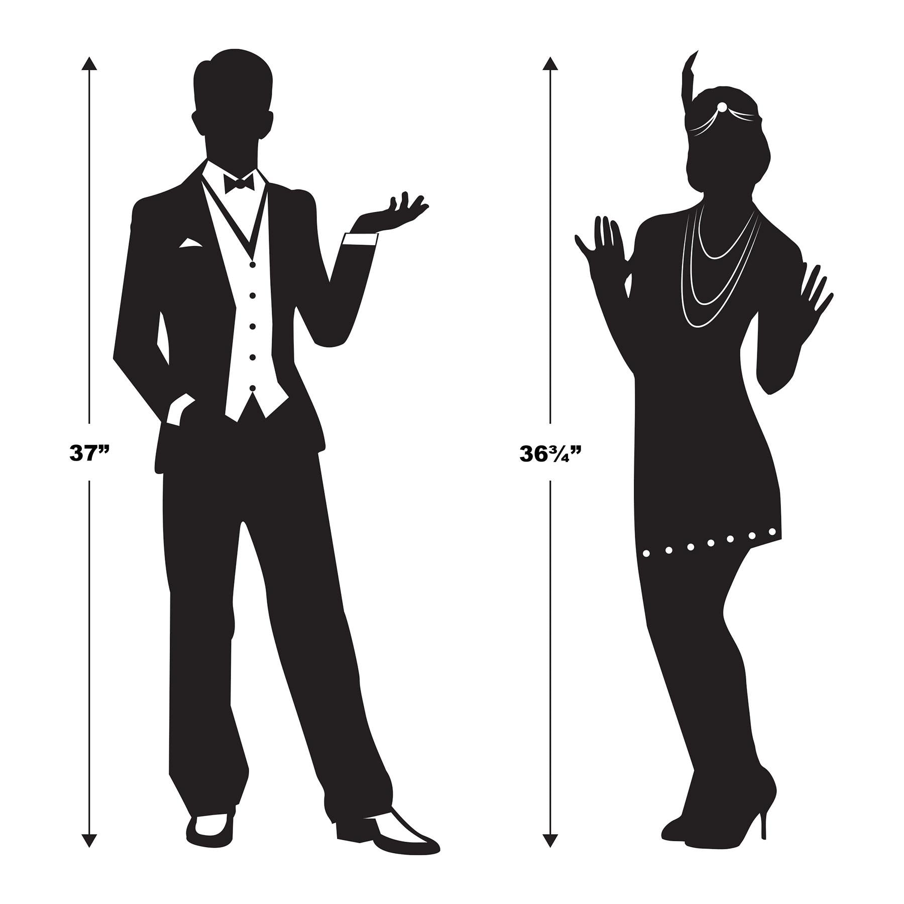 Our Roaring 20's Silhouettes are the perfect addition to any party or event. Each package contains two cutouts that measure 36.75" (approx) and 37" in size. These stylish cutouts are printed on both sides and feature a vibrant design that is sure to create a fun and festive atmosphere. Celebrate the roaring twenties with these beautiful silhouettes. They are perfect for themed birthday parties, anniversaries, or other special occasions. Our Roaring 20's Silhouettes are a must-have item for any event. UPC: 034689074069; Package Count: (2/Package); Packages per Case: 12. Add a touch of class and nostalgia to your event with Our Roaring 20's Silhouettes.