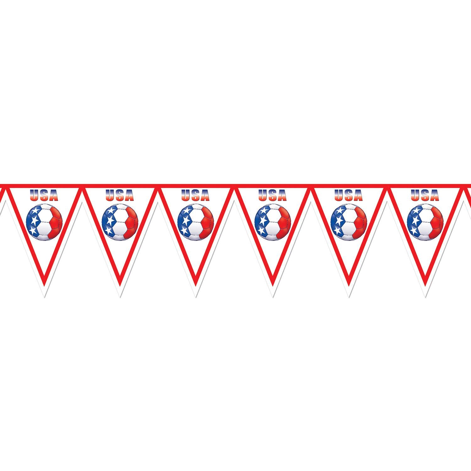 Product Description: Make your next soccer-themed party stand out with the Soccer Ball Pennant Banner from BulkPartySupplies.com. This plastic all-weather banner is perfect for indoor or outdoor use and features 12 colorful pennants with soccer ball designs strung along an 11" x 12ft. string. This banner will give your party a festive, sporty atmosphere and is great for soccer teams, birthdays, or any other special occasion. Each package contains one banner and ships from our Pennsylvania warehouse within one business day. The Soccer Ball Pennant Banner is a must-have for any soccer-themed party. With its vibrant colors and fun designs, this banner will bring a smile to your guests' faces. Whether you're hosting a birthday celebration or a team party, the Soccer Ball Pennant Banner will make your party a hit!