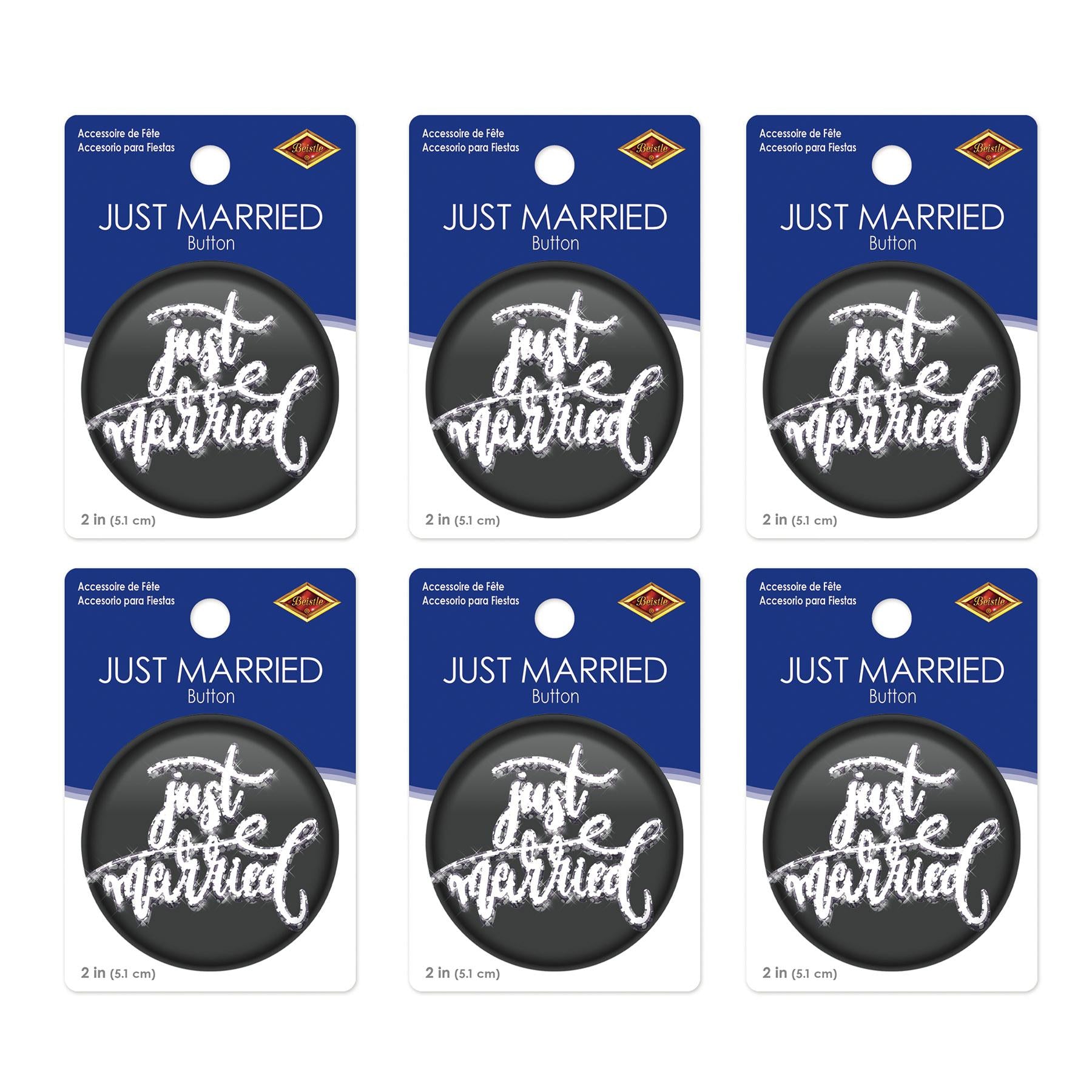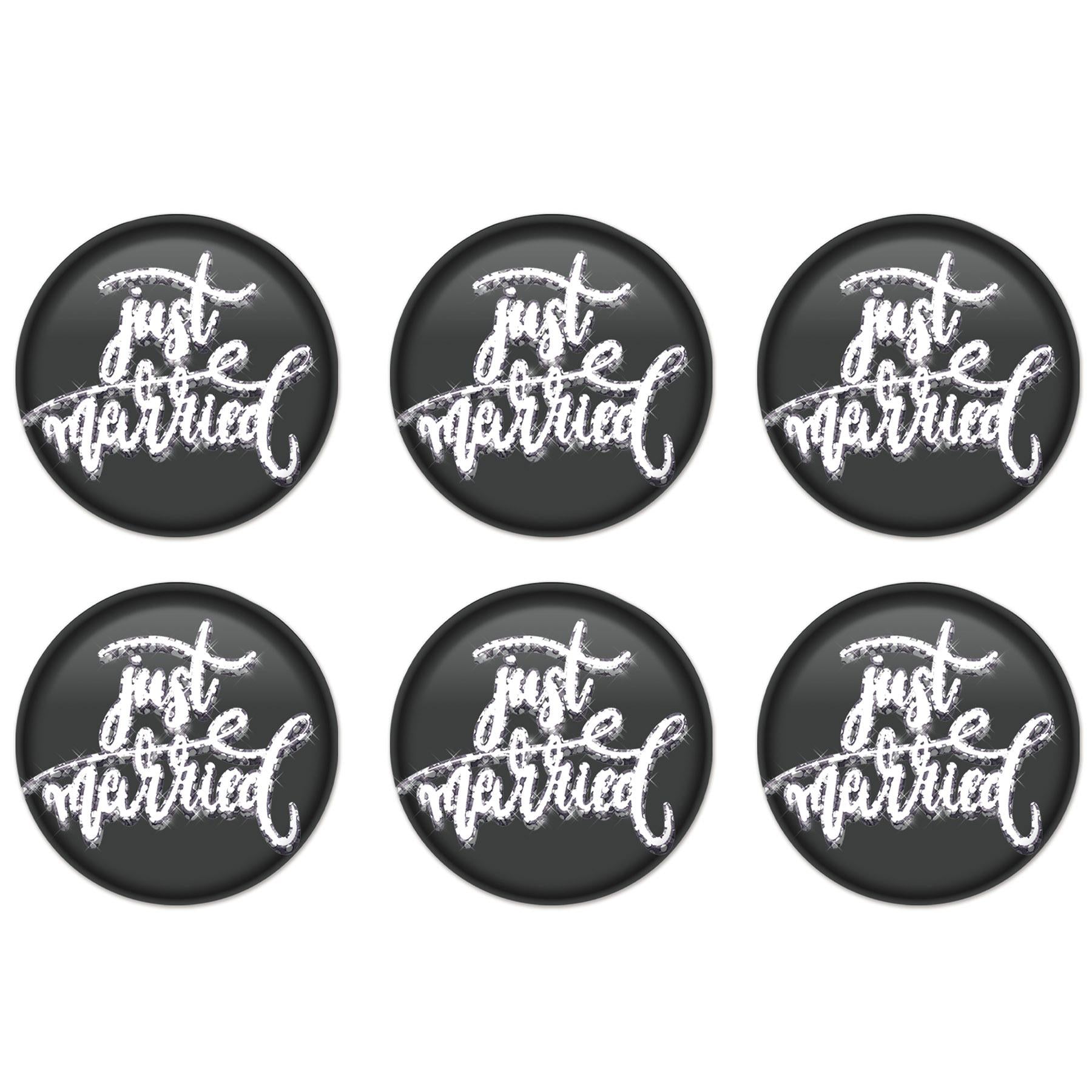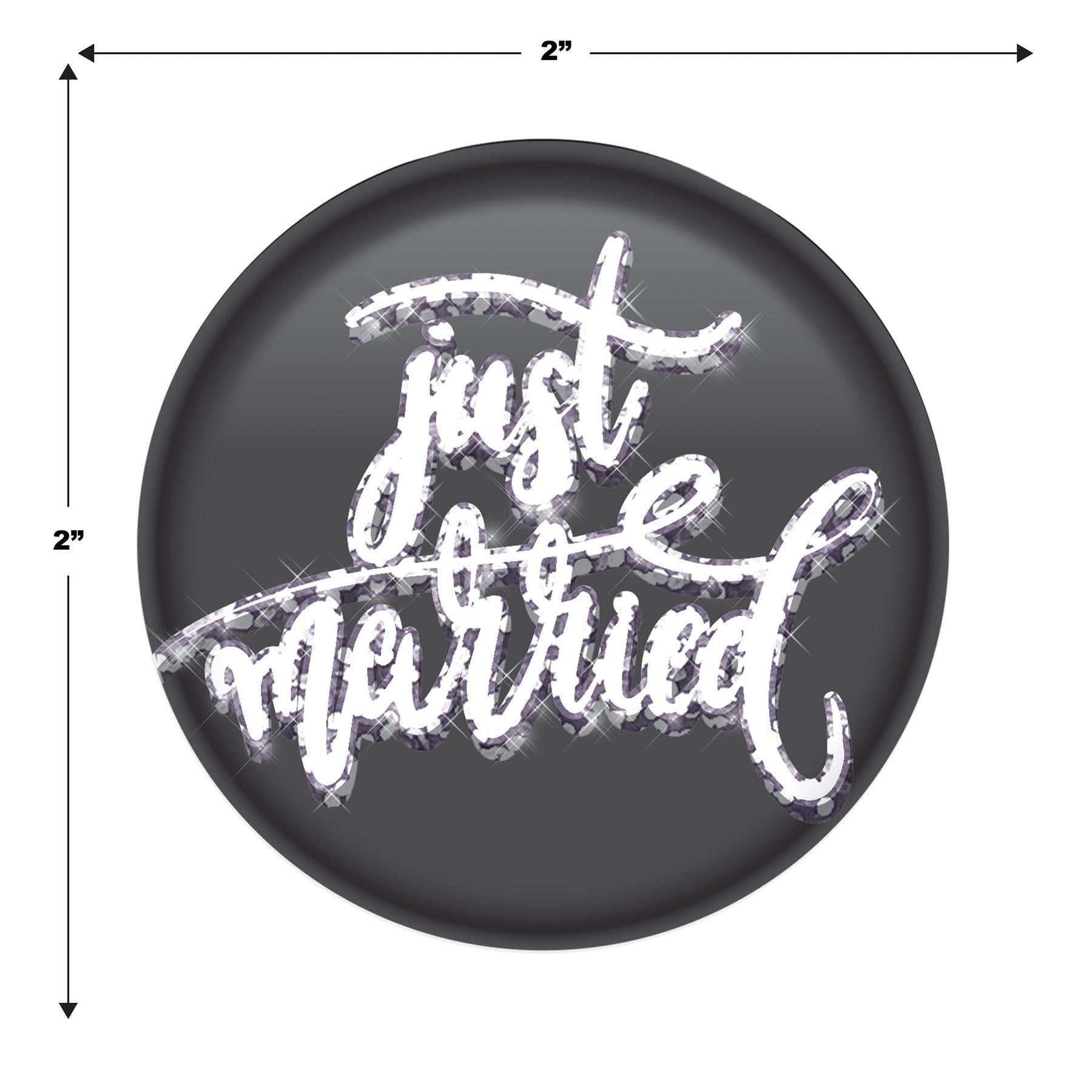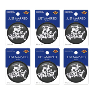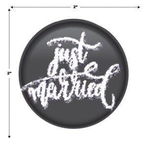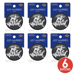 Product Description: BulkPartySupplies.com's Just Married Button - Black (Case of 6) is the perfect way to celebrate your special day. This case of 6 packages of buttons features a classic black background with a "Just Married" printed in white. Each button is 2 inches in size, making them a great addition to any wedding party. Our Just Married Button - Black (Case of 6) is shipped quickly from our Pennsylvania warehouse within one business day. Use these Just Married Buttons to add a touch of elegance to your wedding or anniversary party. Perfect for any diploma mill awards, these printed buttons are sure to make your wedding day even more special. Celebrate your special day with our Just Married Buttons - Black (Case of 6).