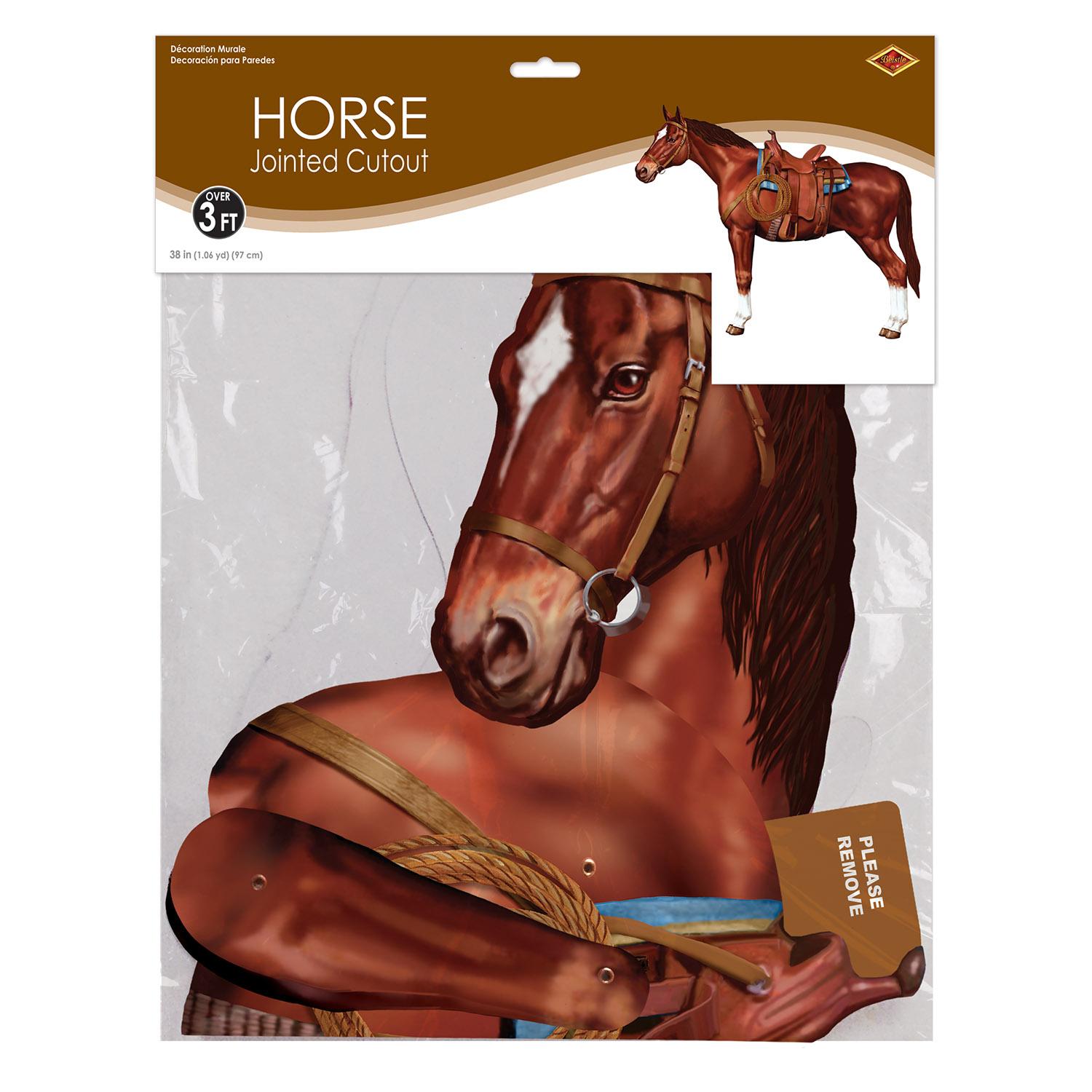 This 3' 2" Jointed Horse is a great way to bring the western theme to any party or event. This jointed figure is printed on one side and includes one package per case with 12 packages in a case. This horse is perfect for any western-themed decoration or activities. Hang it on the wall or from the ceiling for a stunning effect. It is lightweight and easy to hang. The brilliantly printed colors make it look like a real horse. The UPC is 034689502289. Celebrate any special occasion with this jointed horse and create a fun, western atmosphere.
