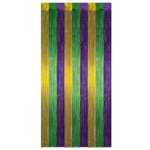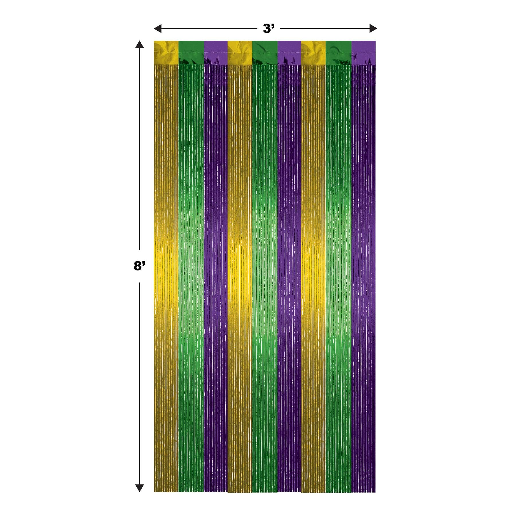 Details: Decorate your Mardi Gras Party with these gold green and purple Gleam 'N Curtains! Size: 8'x 3'. Individually packaged: (1/package). Pieces/packages per Case: 6.