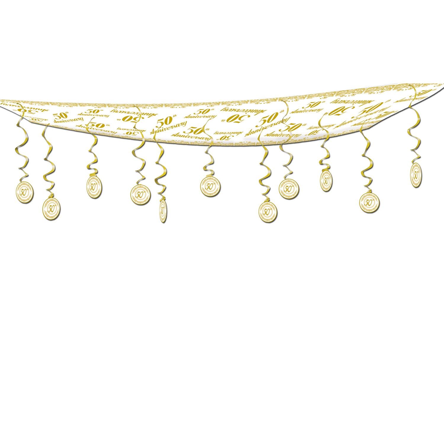 Product Description: Celebrate a milestone anniversary with Our 50th Anniversary Ceiling Decor! This 12 by 12 inch package is perfect for a hanging decoration or ceiling decor. The package includes one piece of decor, making it easy to quickly add a festive and celebratory touch to the occasion. This product is a great selection for any anniversary, making it a must-have for any party supplies. Plus, it ships from Pennsylvania warehouse within one business day, so you don't have to worry about it arriving late. With Our 50th Anniversary Ceiling Decor, you can make any anniversary a special one!