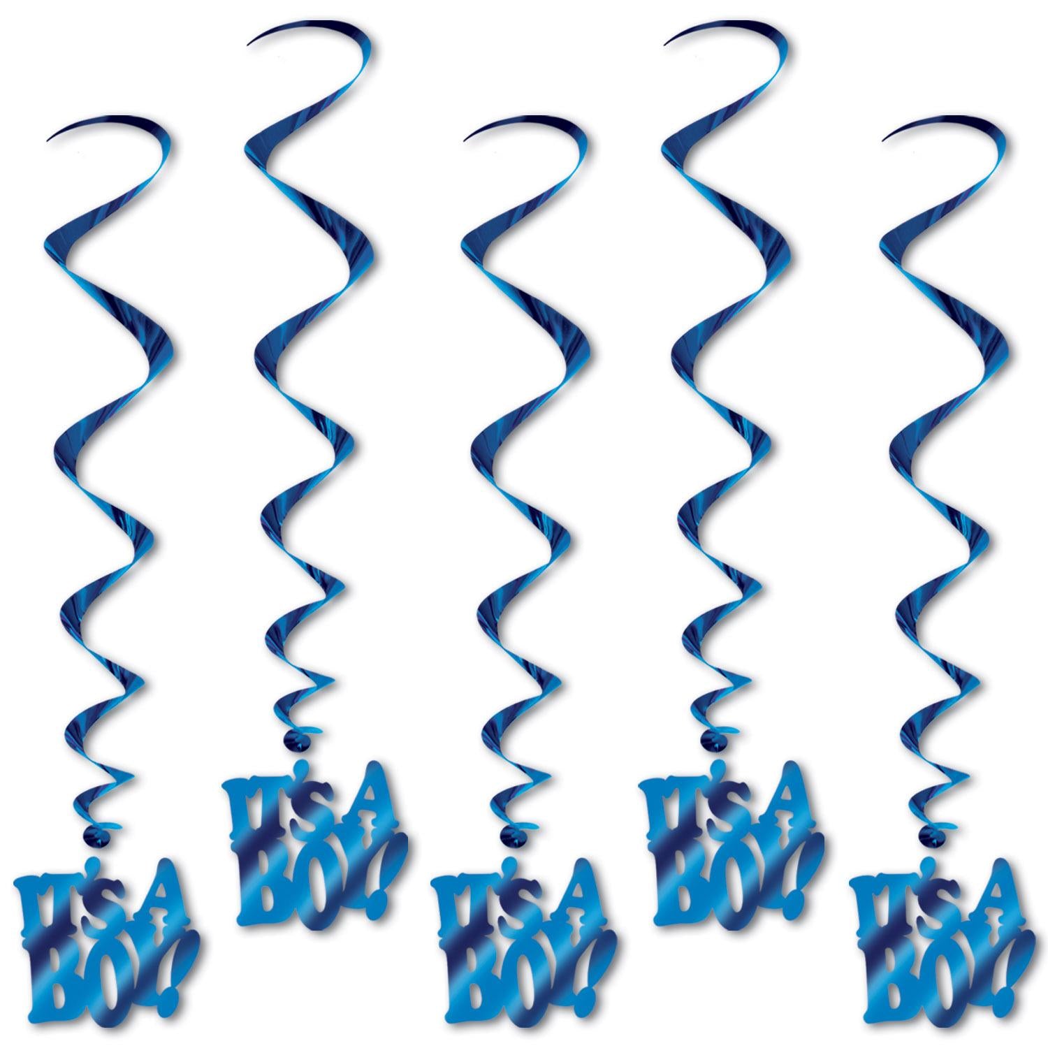 Product Description: Welcome the arrival of a baby boy into the world with the It's A Boy! Whirls from BulkPartySupplies.com! This set of five 3' whirls are perfect for adding fun and festive decorations to any baby shower or other celebration. These whirls feature a blue and white color scheme, with a star at the center, and the phrase 'It's A Boy!' printed in bold print. Hang them from the ceiling or in any doorway to create a special atmosphere. This item ships from our Pennsylvania warehouse within one business day, so you can plan your party with confidence. With the It's A Boy! Whirls, you can create an unforgettable celebration that celebrates the arrival of a special baby boy.
