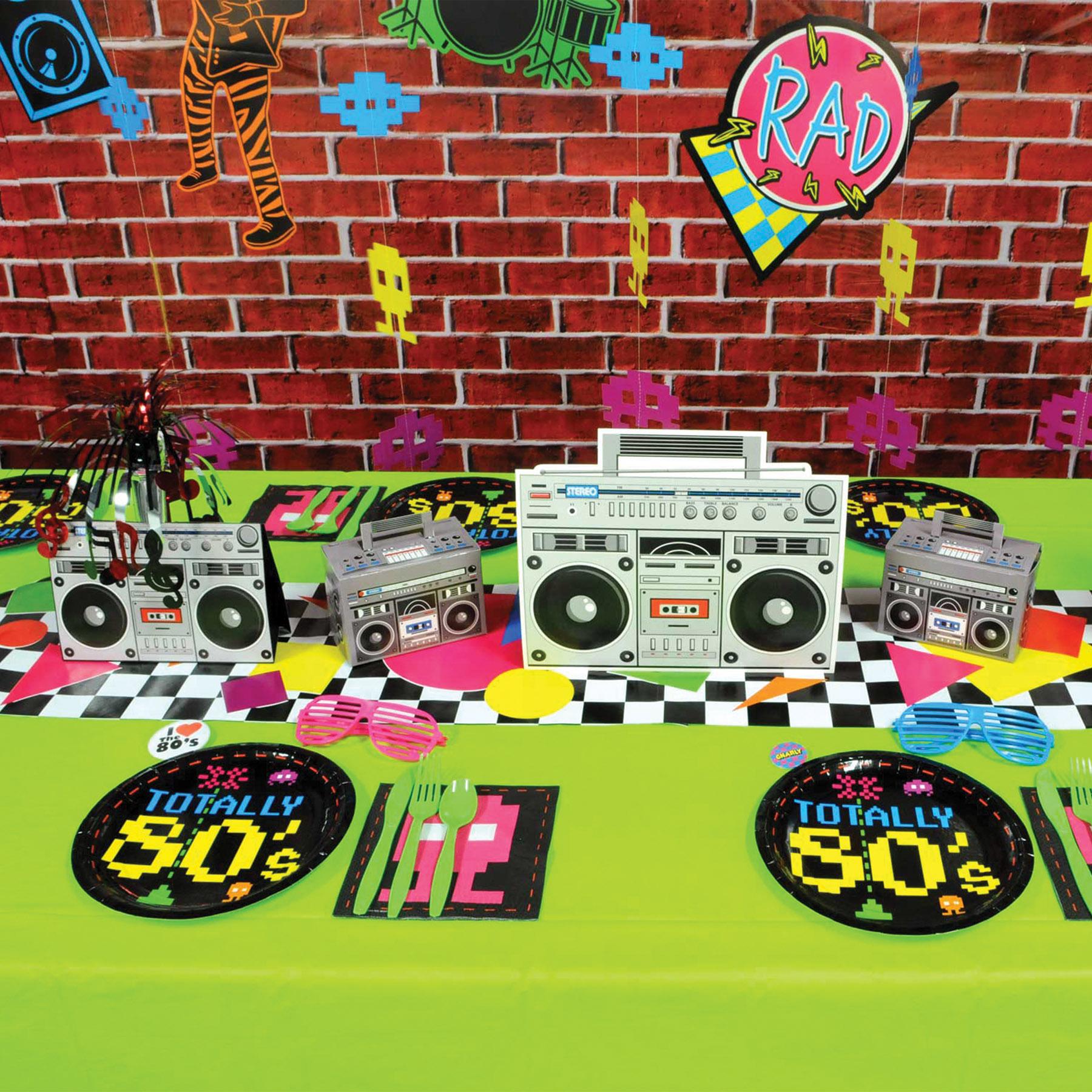 Product Description: The Boom Box Centerpiece is the perfect addition to your 80's themed party decorations. This package comes with one colorful and fun centerpiece that measures 14" in size. The Boom Box Centerpiece is great for centerpieces, cascades, and more. The bright colors and fun design are sure to bring your 80's themed party to life. With quick shipping from our Pennsylvania warehouse, you can have your Boom Box Centerpiece in no time. Our Boom Box Centerpiece is the perfect way to liven up your 80's themed party. With bright colors and a fun design, you're sure to have a party that everyone will remember!