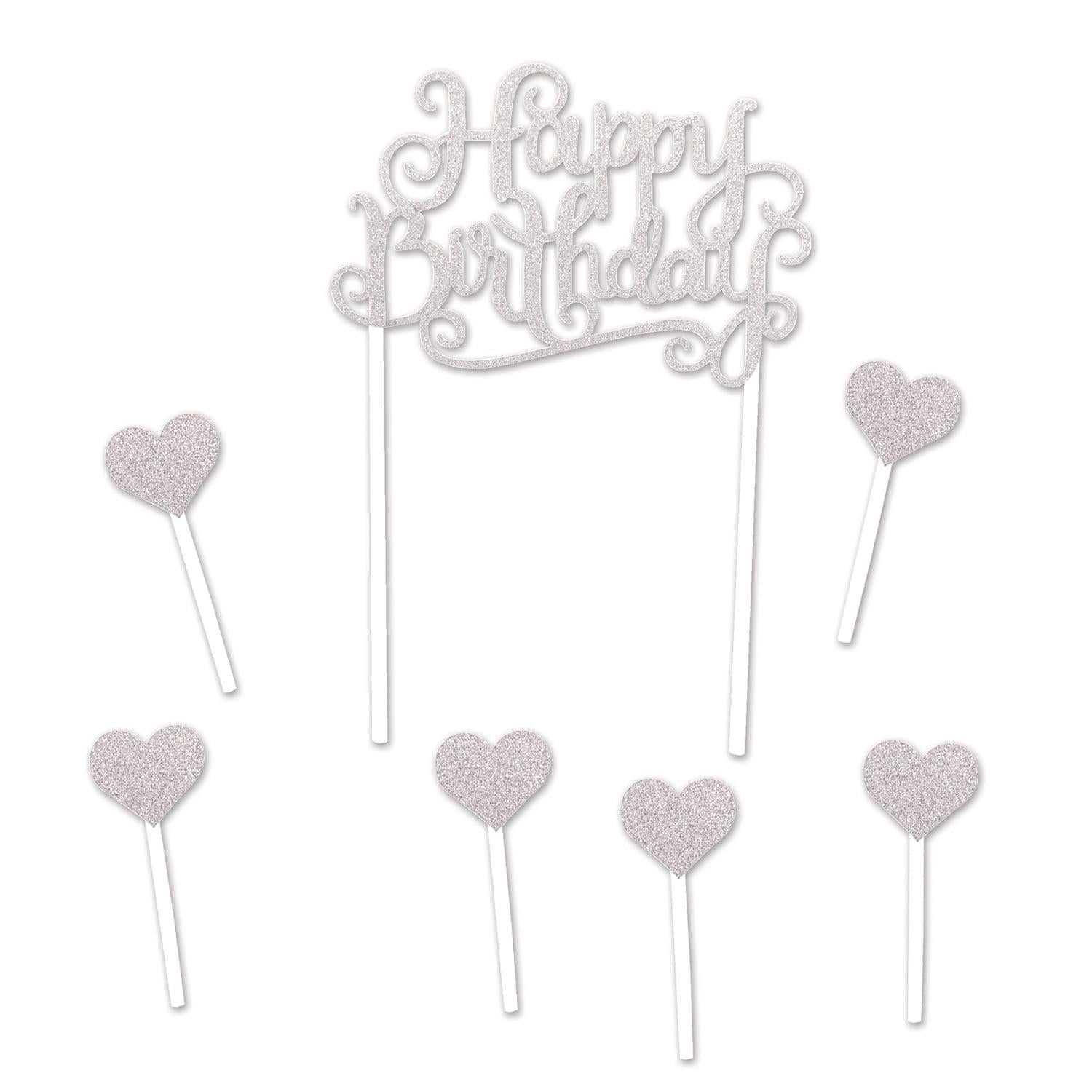 Product Description: Add a touch of fun and sparkle to your birthday cake with this Happy Birthday Cake Topper by BulkPartySupplies.com! This package includes 6 silver heart picks that measure 1.25 inches by 3.25 inches each. The topper itself measures 5.5 inches by 8 inches, making it the perfect size to top off a delicious birthday cake. It's easy to assemble and will add a touch of shine to your special day. Shipping is fast and easy from our Pennsylvania warehouse, so you can get your topper in time for the celebration. This topper is great for birthday parties, food picks, and more! Add some extra sparkle to your special day with this Happy Birthday Cake Topper by BulkPartySupplies.com!