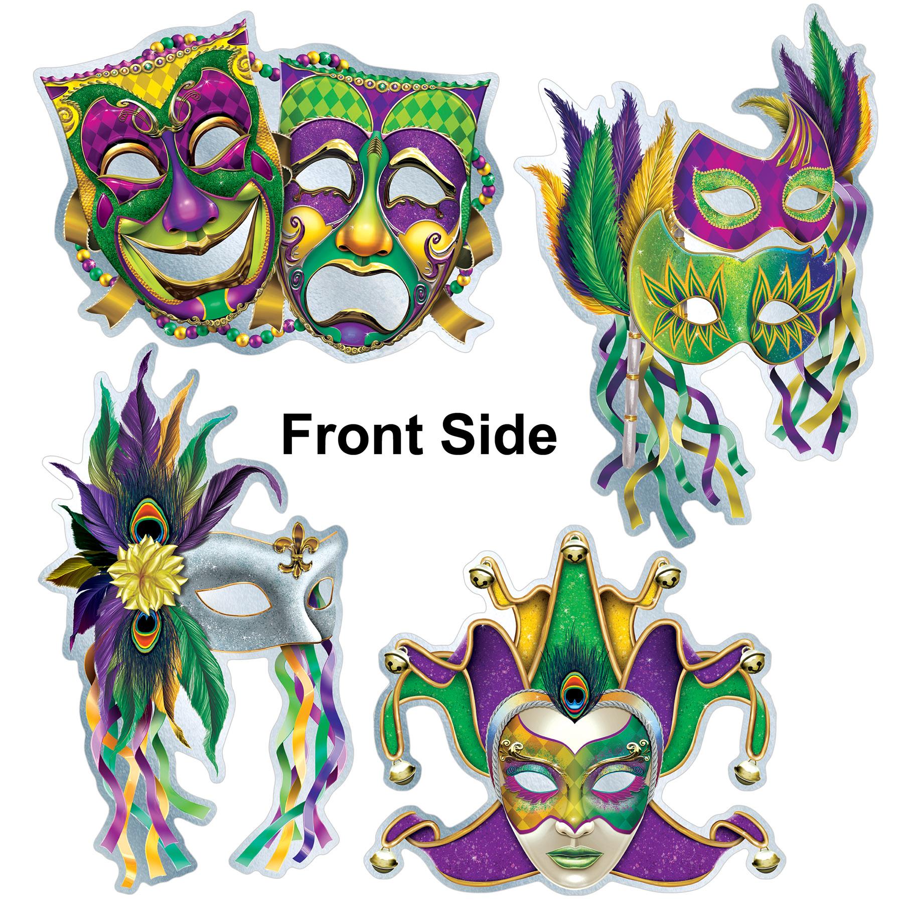 These festive Foil Mardi Gras Mask Cutouts are perfect for any Mardi Gras celebration! The cutouts come in a package of 4, with 12 packages per case. Each cutout measures 18.75" (approximate) to 20.25" (approximate). On one side of the cutout is a beautiful foil finish that will brighten up any party. On the other side, a printed design is featured. UPC 034689069379. These cutouts are sure to add a bit of fun and flair to any Mardi Gras celebration! Hang them on your walls or anywhere else you desire to create an eye-catching and colorful atmosphere. Make sure to add these Foil Mardi Gras Mask Cutouts to your Mardi Gras celebration supplies today! Keywords: Mardi Gras, Cutouts, Foil