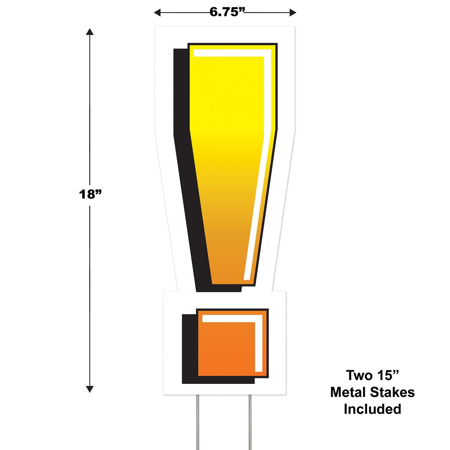 Product Description: The Plastic Exclamation Mark Yard Sign is the perfect addition to any party, special occasion, or event! This all-weather sign is made from durable plastic and measures 18 inches. It comes with two metal stakes for easy assembly and it ships from Pennsylvania warehouse within one business day. This sign is an eye-catching way to make a statement at any gathering, adding a fun and festive atmosphere to any event. It's perfect for any celebration or get-together, indoors or outdoors. With its bright colors and unique design, this Plastic Exclamation Mark Yard Sign is sure to be a hit with party guests of all ages.