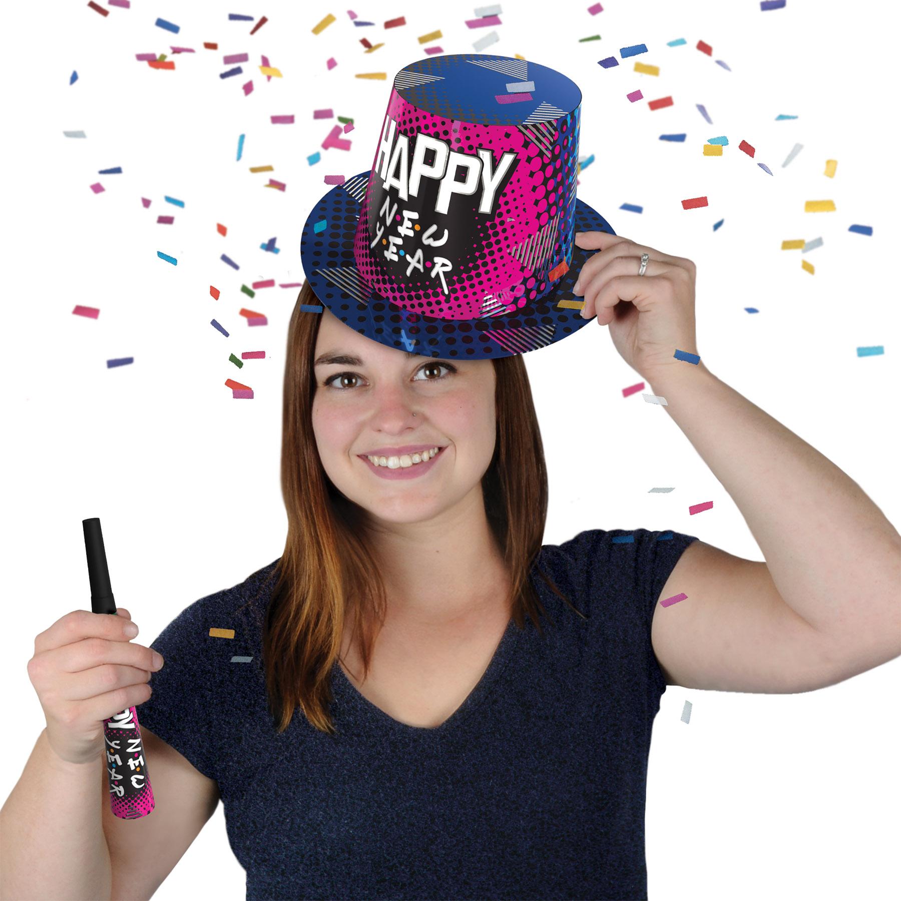Product Description: Celebrate the New Year in style with the 90's Hi-Hat from BulkPartySupplies.com. This one-size-fits-most hat is the perfect addition to your New Year's Eve party supplies. It is made of durable foil material and ships from our Pennsylvania warehouse within one business day. The 90's Hi-Hat is the perfect way to start the year off right, and will be a hit at any New Year's Eve celebration. With its bright colors and eye-catching design, this hat is sure to make a statement. So what are you waiting for? Get your 90's Hi-Hat today and start the party off in style!