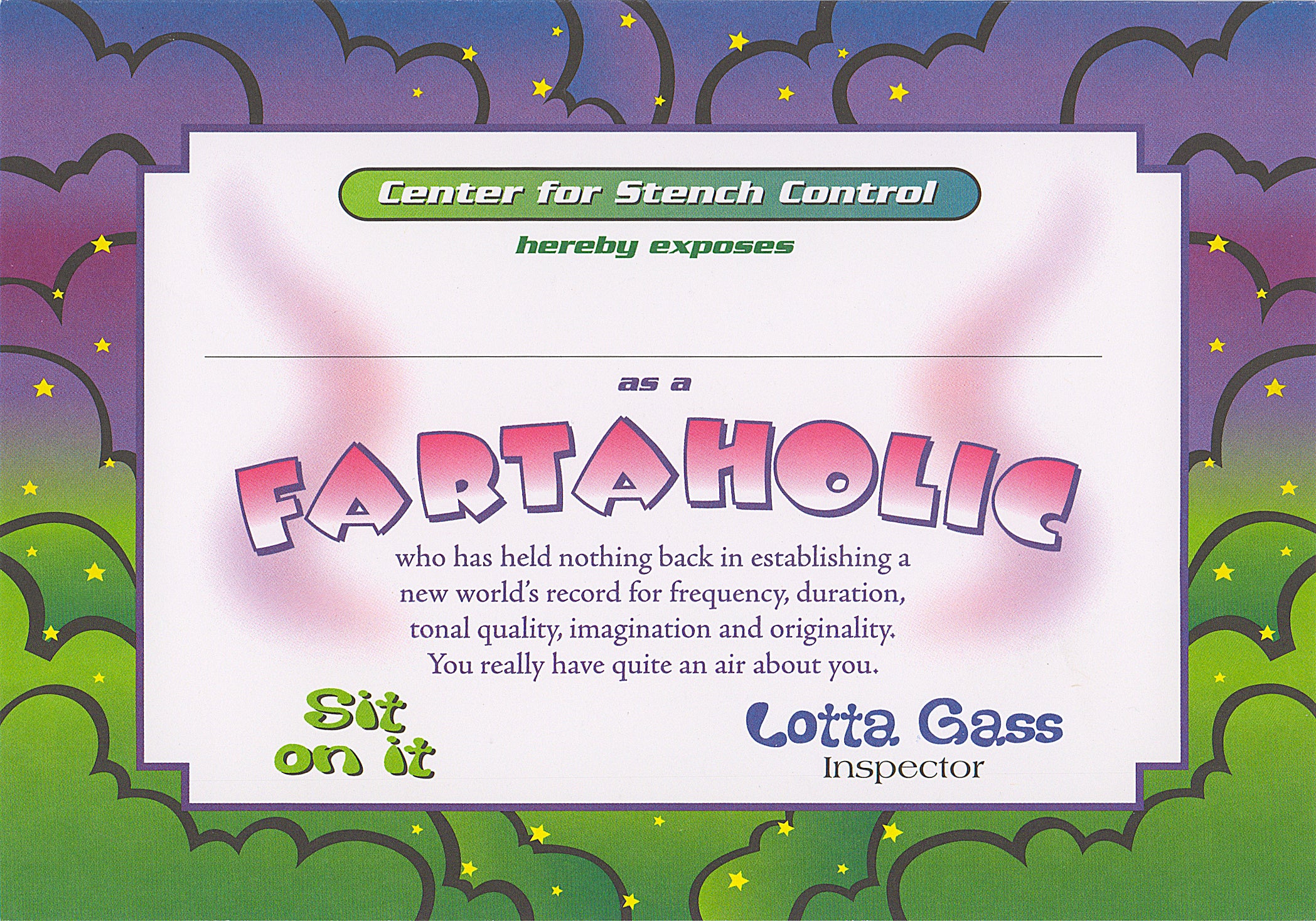 Product Description: This Fartaholic Certificate is the perfect way to reward your friends for their comedic talents! This certificate is 5 inches by 7 inches and comes in a pack of 6. It's perfect for any general occasion or diploma mill awards. It's a fun way to show your appreciation and will make your friends laugh. The certificate has a fun, lighthearted message that reads, "Fartaholic". It's the perfect way to make your friends smile and show them how much you appreciate their humor. Plus, it ships from our Pennsylvania warehouse within one business day! Buy in bulk and save when you purchase This Fartaholic Certificate (Case of 6) from BulkPartySupplies.com.