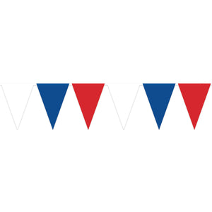 Our Red, White & Blue Oversized Pennant Banner is the perfect addition to your patriotic events. These banners are ideal for creating a festive atmosphere. With dimensions of 28 inch x 25ft and packaging of 1/package, each case includes 12 packages, making it easy to cater to gatherings of any size. These versatile items enhance the ambiance of any celebration. Red, white, blue; all-weather; 12 pennants/string.