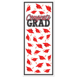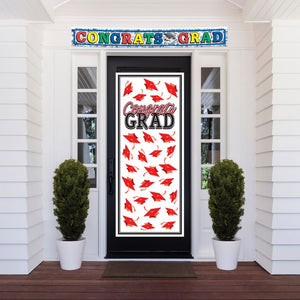 Our Red Congrats Grad Door Cover is the perfect addition to your graduation events. These hanging decorations are ideal for creating a festive atmosphere. With dimensions of 6ft x 30 inch and packaging of 1/package, each case includes 12 packages, making it easy to cater to gatherings of any size. These versatile items enhance the ambiance of any celebration. Red; all-weather.