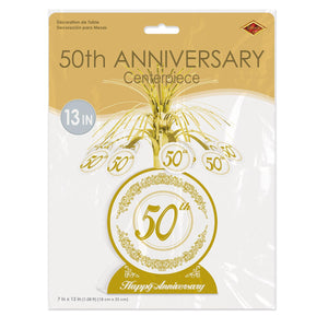 This 50th Anniversary Centerpiece is the perfect way to celebrate a momentous milestone. The centerpiece is 13" tall and features cascades of 50th anniversary-themed decorations and accents. This package includes 1 centerpiece and 12 packages per case. It is sure to be the star of the show at any celebration. The vibrant colors and fun accents are sure to bring a festive atmosphere to any occasion. The included UPC is 034689505167. Add some sparkle to the special day with this 50th Anniversary Centerpiece. It is a great way to commemorate the occasion and will be a treasured keepsake for years to come.