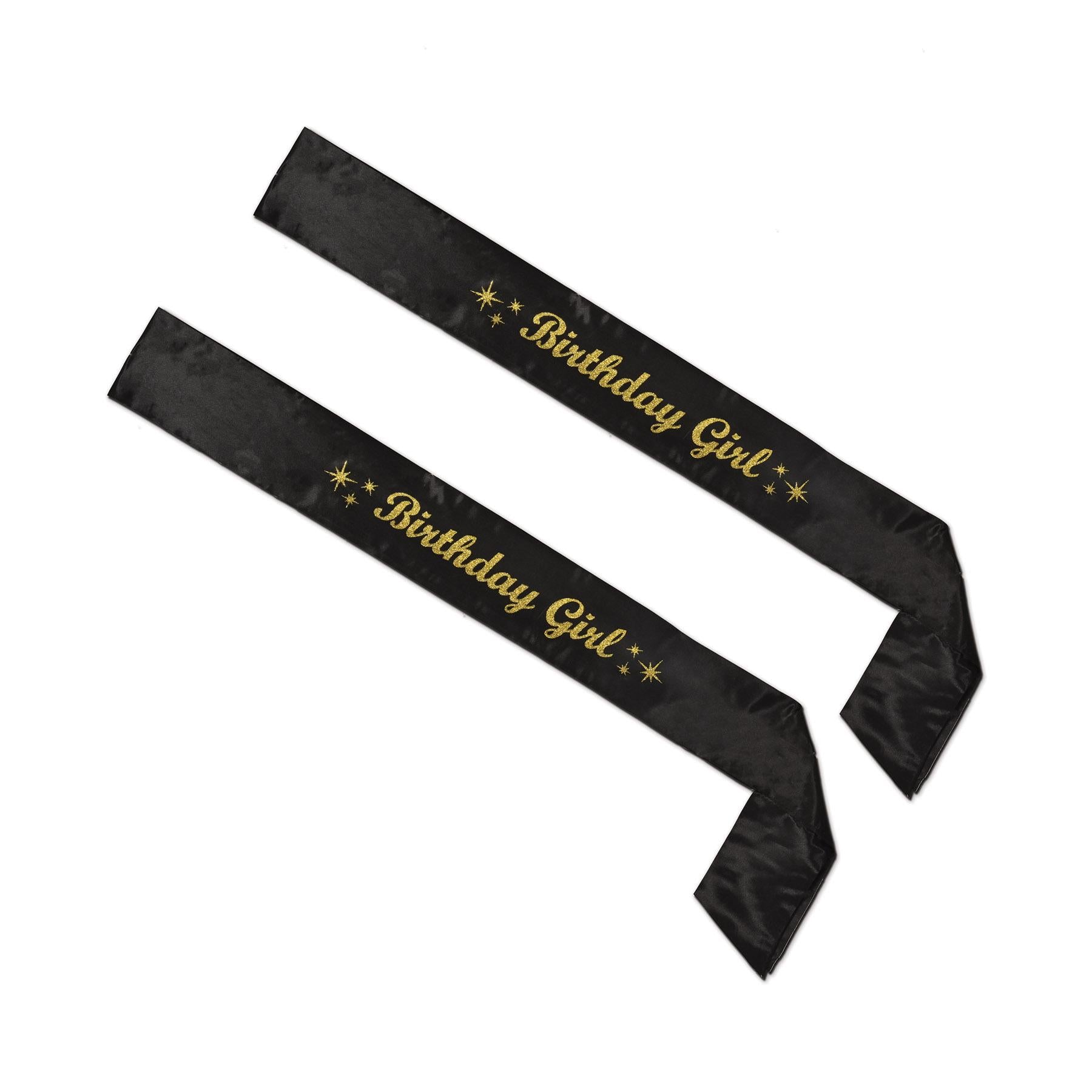 Product Description: Our Glittered Birthday Girl Satin Sash is the perfect way to make any birthday girl feel special. These 33" x 4" sashes are made of luxurious black satin with gold glitter accents and come in packages of one. With six packages per case, you can easily have enough sashes for all the birthday girls in your life. The sashes are part of Our Birthday Themed Party Supplies and are sure to add a touch of glamour to any special day. Whether you're looking for a fun costume accessory or a special way to honor the birthday girl, our Glittered Birthday Girl Satin Sash is the perfect choice.