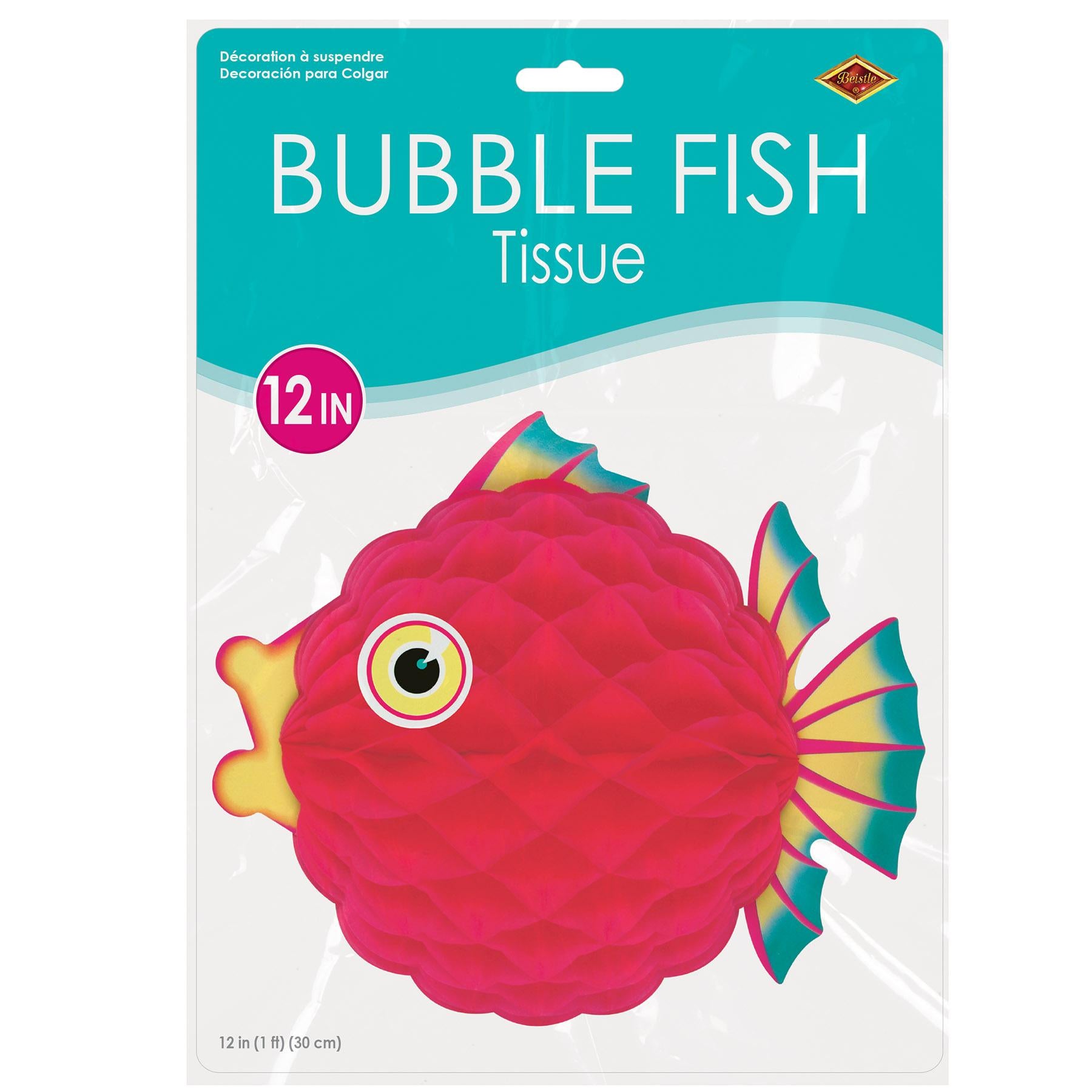 Add a splash of color and some fun to any party with Our Tissue Bubble Fish Hanging Decorations! These fun and whimsical fish decorations are each made of colorful tissue paper, with sparkling metallic accents. Measuring 12" long, these decorations are perfect for any under the sea themed party. Hang the decorations on the ceiling to create a beautiful, festive atmosphere in any room. These decorations come in an assortment of colors and are sure to bring a smile to everyone's face! With one package per case, you can easily stock up on these fun and unique decorations. Add some color and novelty to any party with Our Tissue Bubble Fish Hanging Decorations! UPC: 034689554363.
