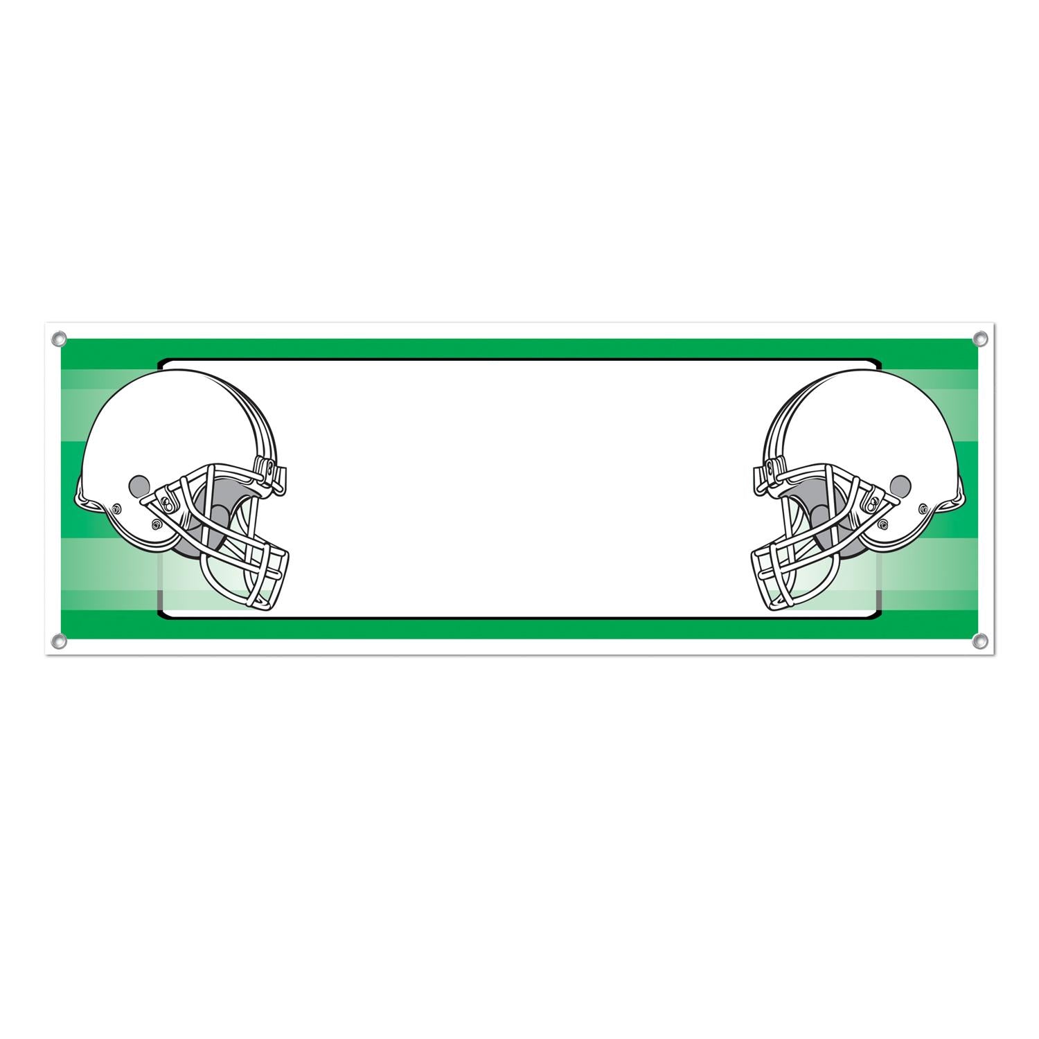 Product Description: The Opposing Helmets Sign Banner is the perfect addition to any football themed party. This all-weather banner is made of a heavy-duty material that is sure to last through multiple uses. The banner features two opposing helmets and measures 5' x 21" with 4 grommets for easy hanging. You will receive one banner in each package and it ships from Pennsylvania within one business day. This banner is a great choice for football themed parties, or any sports themed event. With the Opposing Helmets Sign Banner from BulkPartySupplies.com, you can easily decorate and show your team spirit.