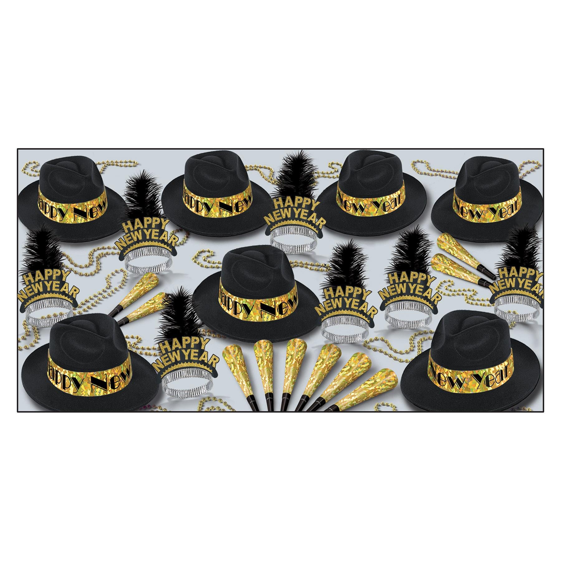 Welcome in the New Year with our Swingin' Gold New Year's Eve Party Kit for 50 People, brought to you. This party kit comes with everything you need to throw a memorable New Year's Eve Party. You'll receive 25 velour fedoras with printed prismatic bands, 25 glittered plumed tiaras, 50 9 inch prismatic horns and 25 33 inch party beads necklaces. With this kit, you can easily create a stylish and festive atmosphere for your friends and family. Plus, it ships from the Pennsylvania warehouse within one business day, so you can be sure to have it in time for the big night. Celebrate the start of 2021 in style with the Swingin' Gold New Year's Eve Party Kit for 50 People.