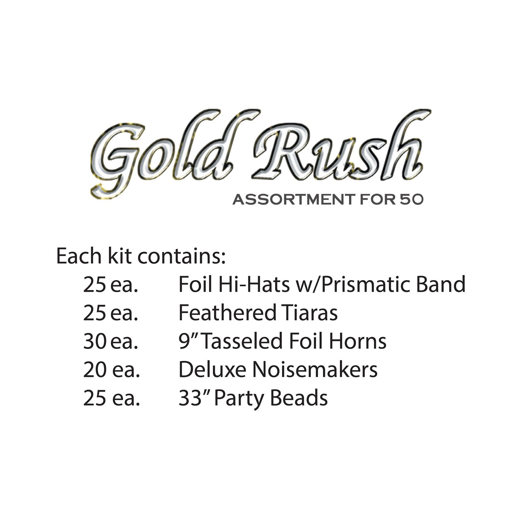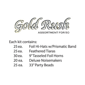Get ready to ring in the New Year with the Gold Rush New Year's Eve Party Kit for 50 People from BulkPartySupplies.com! This kit includes everything you need to create a fun and festive atmosphere, with foil hi-hats, glittered feathered tiaras, tasseled foil horns, deluxe noisemakers, and party bead necklaces. With these high-quality items, your celebration is sure to be a success. Shipping from our Pennsylvania warehouse within one business day, you can plan your New Year’s Eve party with ease. Make your event unforgettable with the Gold Rush New Year's Eve Party Kit for 50 People!